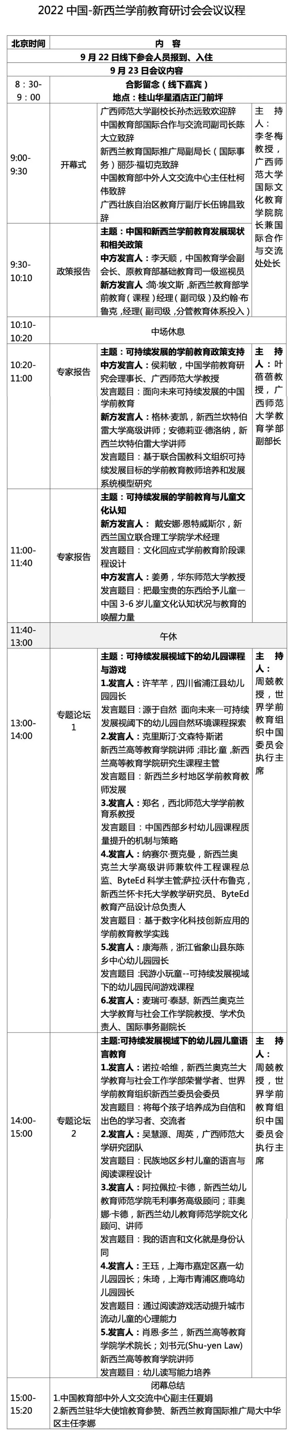 2022年是中国和新西兰建交50周年。为了庆祝中新建交50周年,促进两国民心相通、人民友好,巩固和深化中新两国在学前教育方面的交流与合作,2022中国-新西兰学前教育研讨会(New Zealand-China Early Childhood Education Symposium 2022)将于9月22-23日通过线上与线下结合的形式举行,其中23日为主会议日,欢迎未到场的各位嘉宾线上观看并参与本次研讨会。