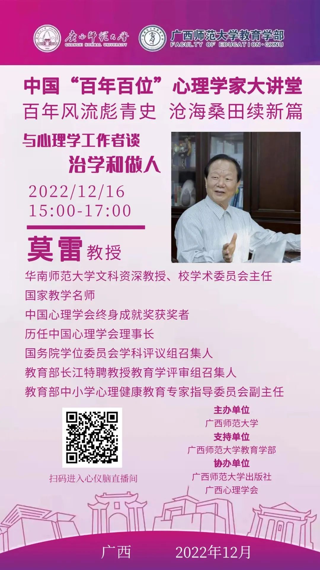 莫雷教授,华南师范大学文科资深教授、校学术委员会主任、国家教学名师、中国心理学会终身成就奖获奖者,历任中国心理学会理事长、国务院学位委员会学科评议组召集人、教育部长江特聘教授教育学评审组召集人、教育部中小学心理健康教育专家指导委员会副主任。
