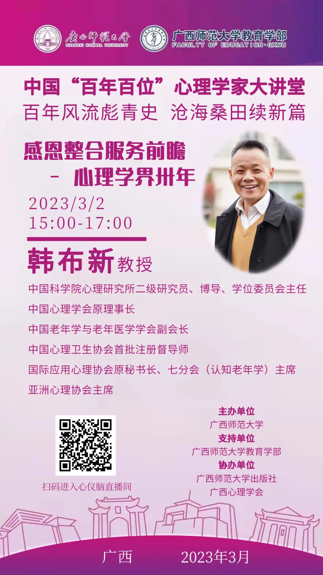 韩布新教授,中国科学院心理研究所二级研究员、博导、学位委员会主任,中国心理学会原理事长,中国老年学与老年医学学会副会长,中国心理卫生协会首批注册督导师,国际应用心理协会原秘书长、七分会(认知老年学)主席、亚洲心理协会主席。